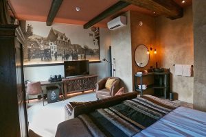 Voor de sanitaire ruimtes, zowel de toiletten in de gewelven kelder als de toiletten en doucheruimtes aan de hotelkamers, is gebruikgemaakt van een stuctechniek die waterproof is. De wanden zijn in een okergele aardetint afgewerkt met Coprox stuc. Dit is een grove waterdichte stucafwerking met een leemachtig resultaat. Dit is door onze eigen mensen aangebracht. Tevens is op diverse plaatsen in zowel het restaurant en kloostergang als de hotelkamers een fotobehang aangebracht. Hierop is het pand te zien begin 20e eeuw. Ook zijn er een aantal wanden geplakt met een fotobehang met een knipoog naar de verbouwing.