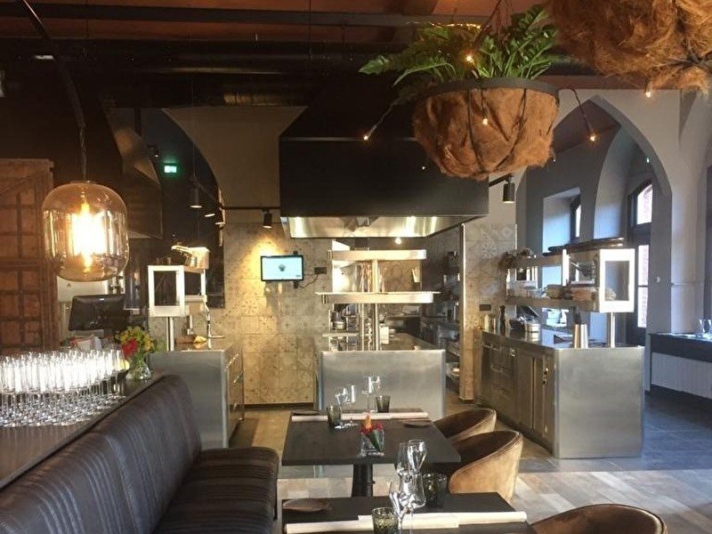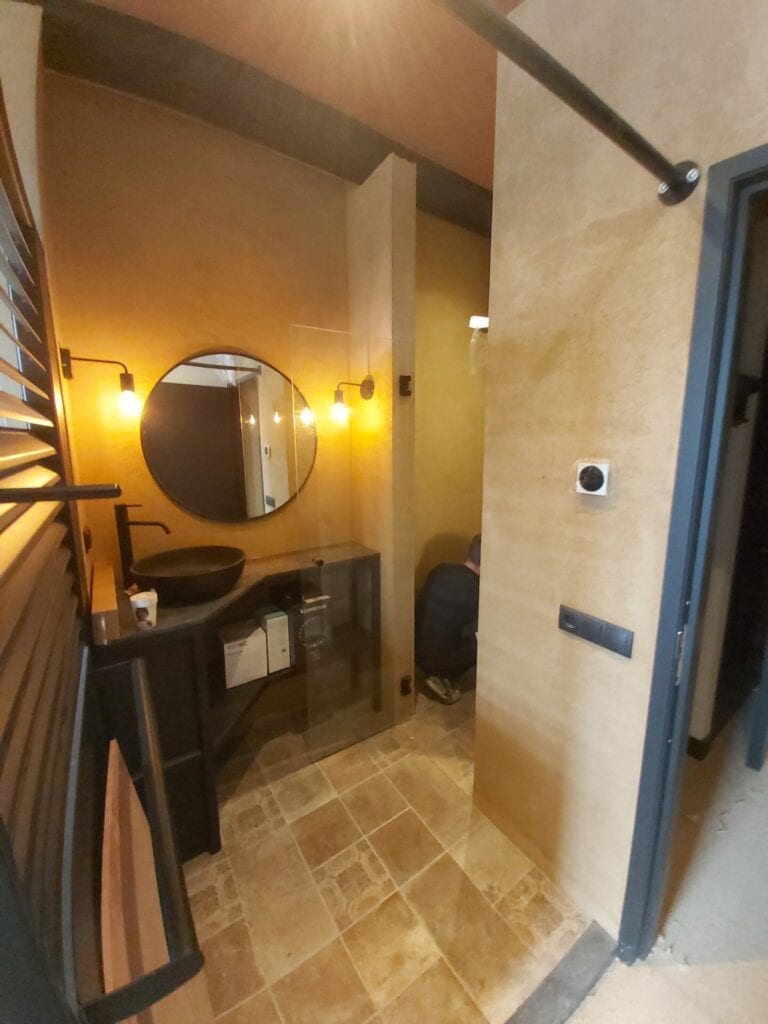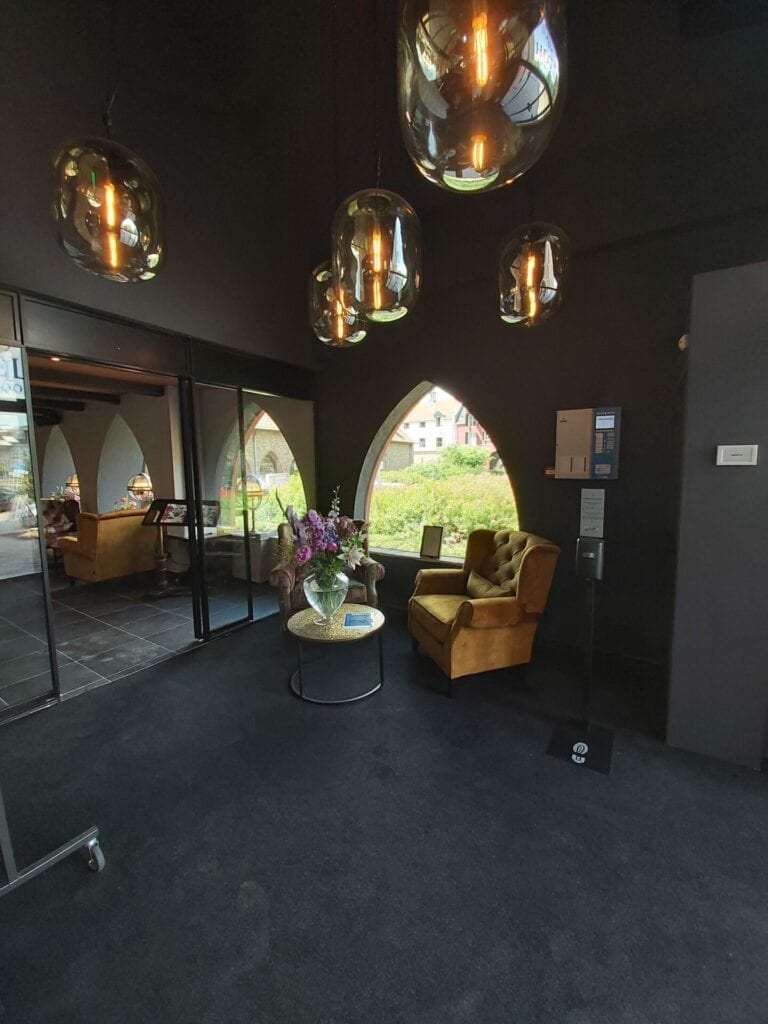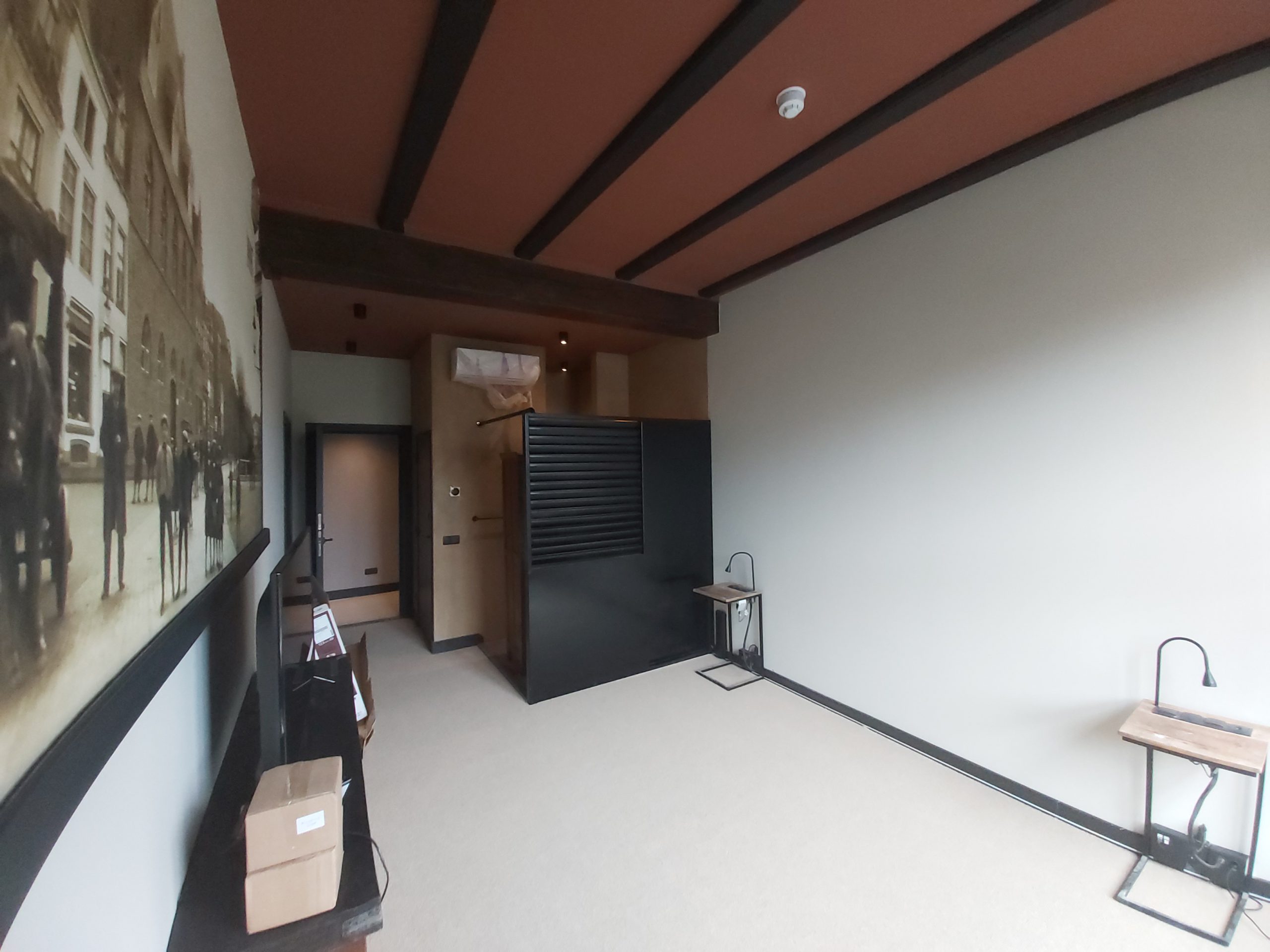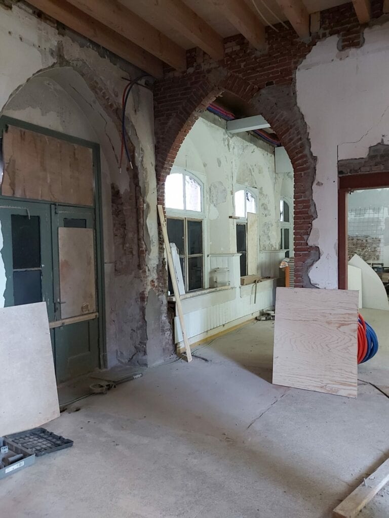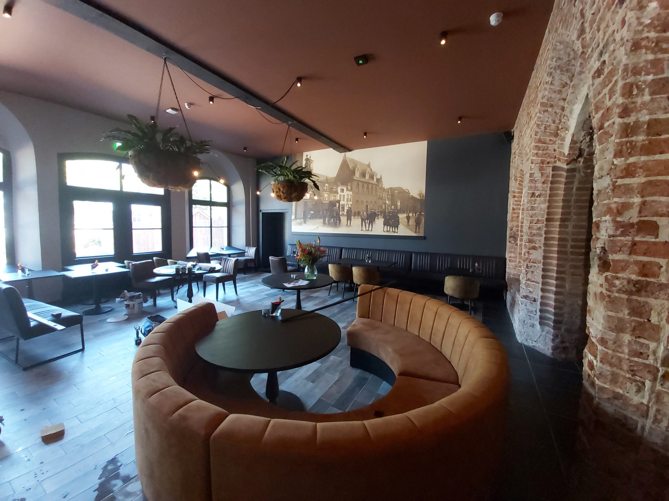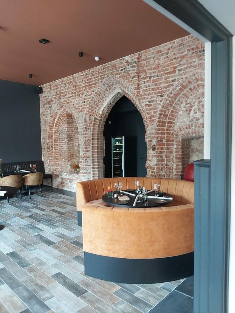 Voor de sanitaire ruimtes, zowel de toiletten in de gewelven kelder als de toiletten en doucheruimtes aan de hotelkamers, is gebruikgemaakt van een stuctechniek die waterproof is. De wanden zijn in een okergele aardetint afgewerkt met Coprox stuc. Dit is een grove waterdichte stucafwerking met een leemachtig resultaat. Dit is door onze eigen mensen aangebracht. Tevens is op diverse plaatsen in zowel het restaurant en kloostergang als de hotelkamers een fotobehang aangebracht. Hierop is het pand te zien begin 20e eeuw. Ook zijn er een aantal wanden geplakt met een fotobehang met een knipoog naar de verbouwing.